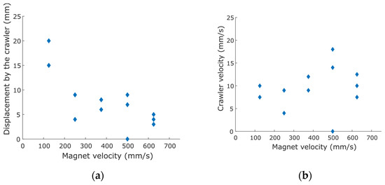 Scatter plot of (a) the displacement by the MAE crawler in one cycle against the average velocity of the magnet, and (b) crawler velocity against the average velocity of the magnet in vertical pipe in the case of peristaltic locomotion. Due to repeated data points, there are less than 3 observable data points for certain velocities.
