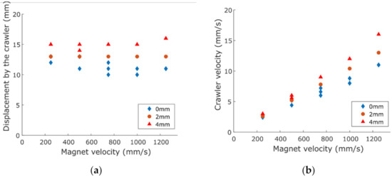 Scatter plot of (a) the displacement by the MAE crawler in 5 cycles against the average velocity of the magnet, and (b) average crawler velocity against the average velocity of the magnet in horizontal pipe with 0 mm, 2 mm and 4 mm magnet distance from the pipe in the case of caterpillar locomotion. Due to repeated data points, there are less than 3 observable data points for certain velocities.