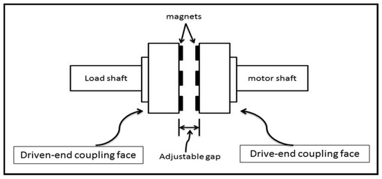 A thruster is a dynamic and critical component of any UUV and the overall performance is primarily defined by the thruster [7]. A thruster not only propels the vehicle but also allows UUV to perform different maneuvers. A thruster consists of different electrical and mechanical parts, i.e., propeller, motor, speed controller electronics, and connecting shaft. A watertight chamber is required for the housing of the electrical components of the assembly. UUV’s thruster utilizes a single shaft to connect the motor with the propeller and for construction, watertight assembly dynamic seals are used. These seals have limitations like wear, tear, and friction, which can cause leakages [8]. Leakages in the sealing of thruster represent a huge loss of potentially valuable equipment and a cause of UUVs inefficiency. The shaft sealing of the thruster is critical in maintaining the overall structural integrity and reliability of UUVs. In permanent magnetic coupling (PMC), mechanical power is transmitted by magnetic field lines without any physical connection between the coupling faces. One end of the coupling is connected with the motor (drive end), while the other is connected with the load (driven end), i.e., propeller, as shown in Figure 1. As there is no physical contact between the drive and the driven end, the electronics in the housing are completely isolated from water. Hence, PMC offers an attractive solution for problems associated with shaft seals.