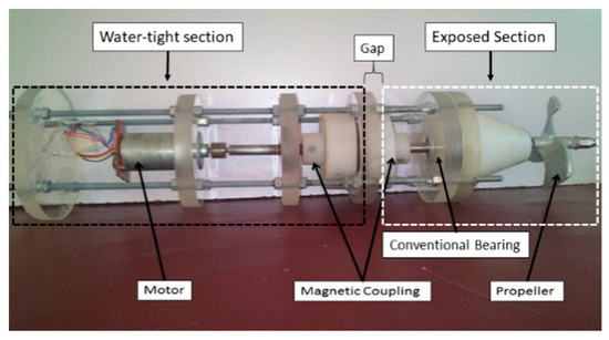 The permanent magnetically coupled thruster assembly is shown in Figure 2, the water-tight section slides inside the enclosure and at the junction between the water-tight and exposed section. There is a separating disc, it separates the two faces of the PMC and it seals the drive end of the coupling and the thruster electronics from the driven end. The propeller is mounted on the driven end which is commonly supported by a conventional bearing, as shown in Figure 2. There are many problems associated with the use of the conventional bearing like lubrication, wearing, and rusting as it is exposed to an uncertain underwater environment [9].