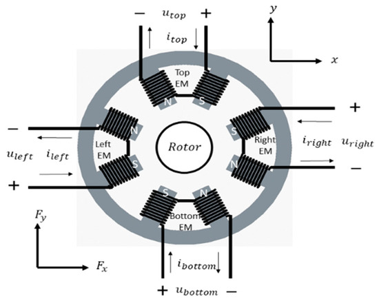 The rotor-bearing system’s equation of motion is constituted, the next stage is the formation of an electrical model of the AMB system. The pair of the coil is serially connected in each EM, as shown in Figure 3, and by this construction two poles are formed in every EM. The resistance and inductance of all the four EM in this study are the same. The correlation between the current through the coil and the applied voltage is given by,