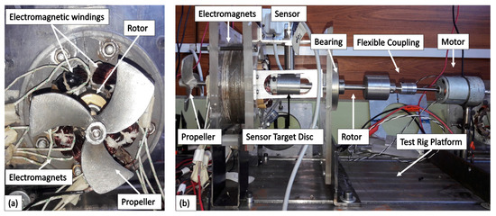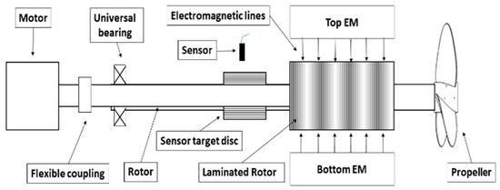 The AMB and the test rig is designed and constructed in house, the configuration of demonstrated AMB rotor is similar to that of a propeller shaft (driven end) of MCT. In this study, a total of four EMs are used which together form a total of eight poles. The rotor is fabricated with ferromagnetic material, hence attractive forces are applied to the rotor when placed inside the EM actuator. The force applied by a EM is , where B is the magnetic flux density, A is the EM pole area and is the relative permeability [38]. For the vertical position regulation top and bottom, EMs generate attractive force, while left and right EMs generate attractive force to regulate horizontal position. In this study heteropolar configuration of the poles is employed, i.e., NS-SN-NS-SN arrangement. The voltages are applied to each EM electronics independently to achieve the desired pole arrangement. The EMs are designed with the requirement to suspend a rotor of 343 g with a clearance of 1.5 mm on each side, i.e., left, right, top, and bottom, respectively. The schematic of the experimental setup is shown in Figure 9.