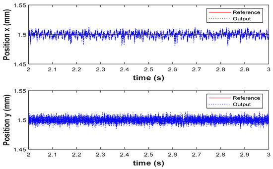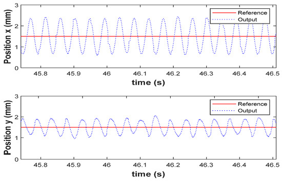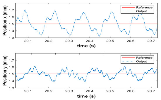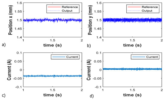 The open-loop unstable rotor-propeller system is stabilized by utilizing LQG controller in real-time. The reference command of 1.5 mm is applied to the rotor, i.e., the geometric center, the subsequent response of the AMB system is shown in Figure 11. From Figure 11, it is evident that, the rotor is not only able to track the commanded reference position but also there is no steady-state error in both axes.