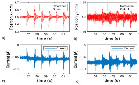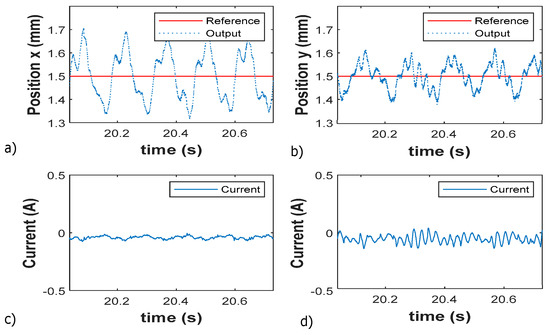 Control current, non-saturation is an important aspect for the design of feedback control algorithm and also for the reliable functioning of the EM actuators. For the compensator design and the linearization of the AMB system dynamics, the basic assumption is , thus enforce a limitation on . During the steady-state functioning of the system, these assumptions must be fulfilled. The control efforts of the AMB system, during reference command tracking, disturbance attenuation, and when subjected to rotation are considered. The control efforts are presented when the rotor is subjected to external disturbances, i.e., impulse forces and the response of the system in terms of position and control current is shown in Figure 13. Figure 13a,b show the position and the respective control current in the horizontal axis. While the vertical axis position and the respective control current is shown in Figure 13c,d. It is evident from the below figure that the bias and the control currents conditions are satisfied for both axes. The control current is responding robustly when the disturbances are applied to the rotor.