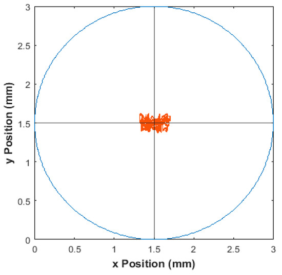 Orbit plot of rotor when spun at 1500 rpm, circle represents the allowable limit of movement for the rotor.
