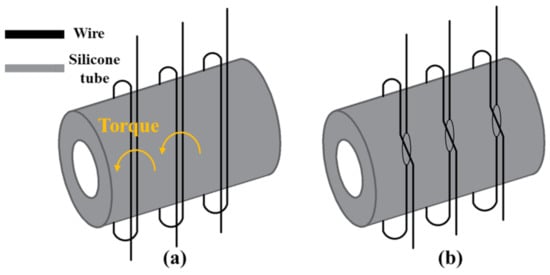 Figure 2b. One end of the wire is passed through the gaps between the intertwined ones, which forms a circle that can be put in the silicone tube. This winding pattern is more stable because each wire is fixed into its places, avoiding interference among wires. However, hysteresis caused by friction appears more prominent in the experiment. Hence this paper uses the second method to manufacture the prototype.