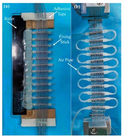 Figure 5a. The board is composed of a ruler, several fixing sticks, and adhesive tapes. The fixing sticks support silicone tubes and fix their positions. These sticks can be glued on the setting positions accurately through the scale on the ruler by hot-melt adhesives. On the top and bottom of the ruler are the adhesive tapes, which can fix the wires. First, put the silicone tubes on the fixing sticks. Then fix one end of the wire on the adhesive tape, wrap it on silicone tubes one by one according to the winding pattern 2 described in