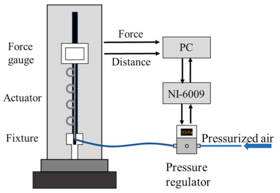 Figure 5b. Then, both force and displacement were set to zero on PC. The pressurized air was provided by an air compressor and adjusted by a pressure regulator (ITV1020, SMC). The current pressure of the system was acquired by a DAQ card (NI-6009) to be transmitted to the PC and be recorded. When the pressure reached desired value stably, the test bench drives HPAM slowly to move down (5 mm/min), simulating the quasi-static movement. Once the actuator reaches the shortest state, i.e., the output force equals zero, the force gauge moves up with the same speed to the initial position. This process was repeated at 3 pressures (100 kPa, 150 kPa, 200 kPa) 3 times to obtain the output characteristics of HPAM.