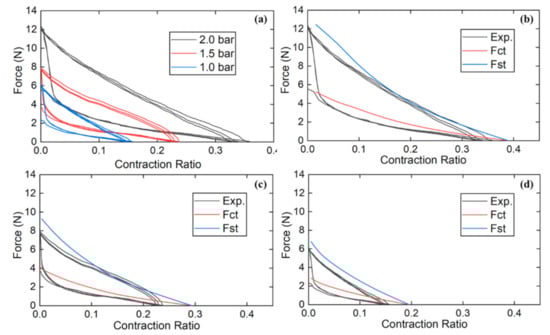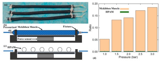 Figure 8d. It can be seen that the ratio of Mckibben muscle gradually increased to 18.32% when pressure increased, which means that when the output force increased, the extra squeezing force increased faster. However, HPAM did not show obvious extra squeezing.
