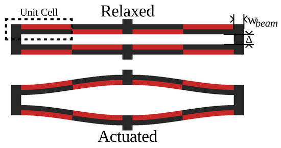 As mentioned above, bimorph-based designs can easily improve on the basic geometry by joining two end-to-end. As can be seen in Figure 1, this modification creates a structure that, when actuated, forms a slight S shape, and more importantly, keeps both endpoints parallel throughout the range of travel. This parallelism facilitates the attachment of both loads or other s-drives to the structure. Typically, in a bimorph, the electrodes are separated along the width axis of Figure 1. This electrode arrangement is problematic, chaining multiple devices together, as it requires a complex routing of wires to connect subsequent elements. Thus, in this geometry, the electrodes are separated along the thickness axis instead of the width axis of the structure (Figure 1).