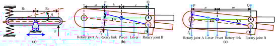 There are three critical factors for variable stiffness mechanisms based on a lever, namely, the point of action of the external force, the position of the connection of the springs, and the pivot location [23]. As shown in Figure 1a, in the design of the variable stiffness mechanism with a movable pivot, the location of both the external force and the springs is kept constant, whereas the location of the pivot can be tuned. F denotes the external force, and R1 and R2 denote the distance from the pivot position to the points at which the springs connect and the force acts, respectively.
