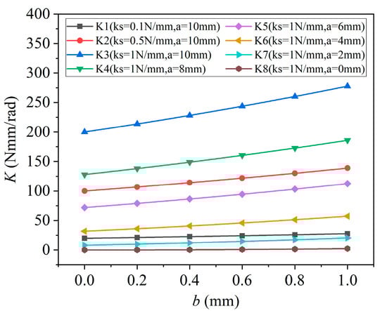 As shown in Figure 2, we quantitatively analyze the effect of the factors above on the stiffness of the variable stiffness unit. When parameter is 10 mm, the stiffness increases with the increase in spring constant . When the spring constant is constant, the stiffness decreases with the decrease in parameter . To obtain the minimum stiffness, the parameter should be zero. Based on the above analysis, we optimize the connection positions of the fixed link and the rotary link in our five-fingered glove (i.e., the length of distance n), further widening the adjustable stiffness range of our five-fingered glove. The theoretical minimum stiffness of the current prototype in this manuscript is zero. In the following, we will further illustrate the effectiveness of optimizing the variable stiffness unit to enlarge the stiffness range through theoretical analysis.