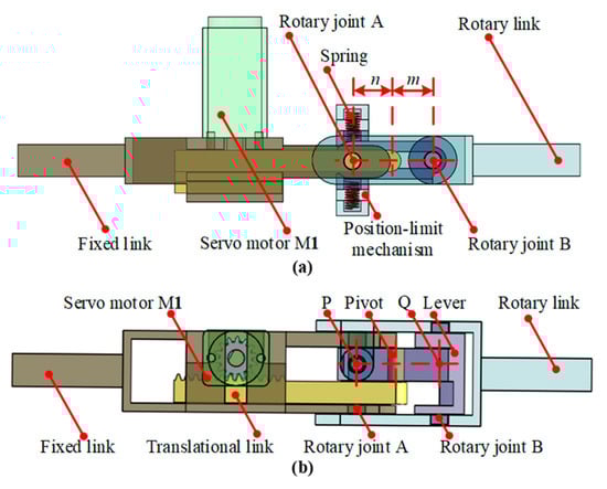 The mechanical realization of the variable stiffness unit of our FFVS glove is shown in Figure 3. A servo motor M1 is rigidly attached to the fixed link and drives the translational link through a gear. The other end of the translational link is the pivot, which is connected to the lever. When the servo motor M1 runs, the pivot position changes as the translational link moves. The fixed link, lever, and rotary link form two revolute joints A and B. The rotation angle of the rotary link is constrained in the range of ±45° by the limiting mechanism of the variable stiffness unit.