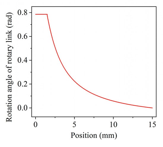 In addition, we investigate the variation of the maximum rotation angle of the rotary link with the location of the pivot. As shown in Figure 4, the maximum rotation angle of the rotary link is constrained to be 0.785 rad (45°) when the distance between point P and the pivot is less than 1.5 mm. As the distance between point P and the pivot increases, the maximum rotation angle decreases. When the pivot moves to point Q, the variable stiffness unit forms a rigid body and the rotation angle becomes zero.