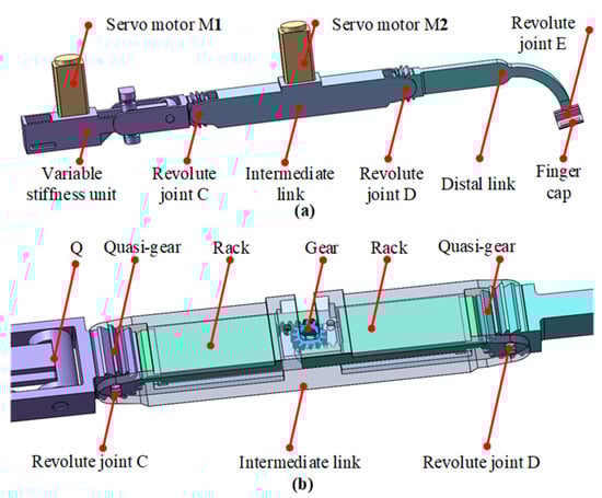 In the FFVS glove, each finger has the same structure. Taking the middle finger as an example, it has three rotary joints, which allow full flexion and full extension. As shown in Figure 5a, the intermediate link connects with the variable stiffness unit and the distal link through revolute joints (C and D). The other end of the distal link transmits the feedback force to the fingertip through the finger cap.