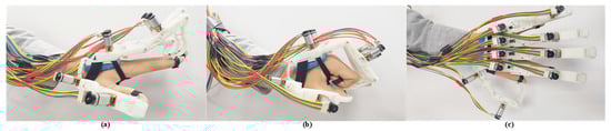 As shown in Figure 7, the finger cap of each finger and the fixed base are, respectively, placed on the dorsal side of the fingertip and the back of the user’s hand. A Velcro band is used to fit different-sized hands, and a foam pad connected to the fixed base further ensures a better fit with the curve of the back of the hands. The motion range of the finger is large enough to achieve ab-adduction and full extension/flexion, adequate to simulate diverse grasping postures. The components of the glove (with the exception of motors) are made of resin and fabricated through 3D printed technology (stereo lithography appearance, SLA). The total weight of the 3D printed components is about 137 g.