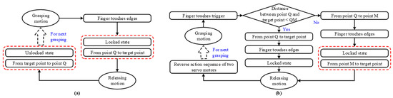 For the variable stiffness unit, the regulating process depends on the control mode, which determines the maximum movement distance of the pivot, affecting the response time for providing haptic feedback. At present, most virtual interaction systems adopt a simple control method called, in this paper, the direct control mode. The detailed control process of the direct control mode is shown in Figure 8a and Figure 9a. In simulating the grasping motion, when the virtual finger touches the edges of the virtual cube, the pivot is actuated by the servo motor M1 and moves from point Q to the target point. Simultaneously, the working state of the revolute joins C and D transforms from the unlocked state into the locked state. On the contrary, in simulating the releasing motion, when the virtual finger departs from the edges of the virtual cube, the pivot moves to point Q and the two revolute joints unlock. Although the direct control mode has the advantage of a small backdrive force (details in Section 5.2), the response time of the variable stiffness unit exceeds 45 ms when the target point is far from point Q (e.g., when the target is point P, the response time is 75 ms). In the following section, we will describe how to overcome this challenge.
