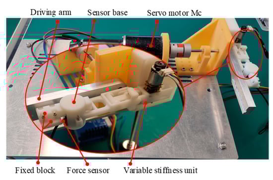 To quantitatively evaluate the stiffness performance of the variable stiffness unit, we developed a stiffness measurement device. As shown in Figure 10, the variable stiffness unit is connected to the measurement device, and the force sensor is placed in the sensor base. The torque generated by the servo motor Mc is transmitted to the force sensor through the driving arm, fixed block, and sensor base. To reduce the assembly gap, the rotary link of the variable stiffness unit and the sensor base are integrated into a single component through 3D printing.