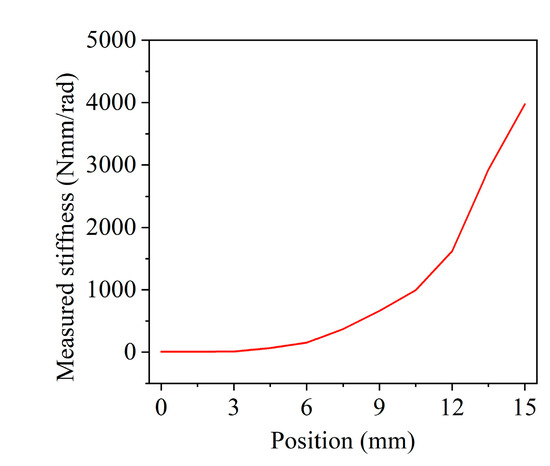 During the measurement process, when the pivot moved from point P to point Q, 11 sampling points were selected at equal intervals. The servo motor Mc drove the driving arm to rotate after the pivot had moved to the setting position. The rotation angle and the feedback force were measured using the optical encoder and ATI Nano17 force sensor (ATI Industrial Automation Inc., US), respectively, on the basis of which we obtained the stiffness of the variable stiffness unit (Table 1 and Figure 11)