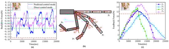 Figure 12a compares the backdrive force between the direct control model and the predictive control mode. We can see that the maximum backdrive force of the direct control mode is no more than 0.08 N when simulating free space (i.e., the pivot was at point Q, and the revolute joints C and D were unlocked). For the predictive control mode, we found that it took less than 45 ms from point Q to the middle point. Therefore, we chose the middle point as point M, described in Section 4. When the pivot was at the middle point and two revolute joints (C and D) were unlocked, the maximum backdrive force of the predictive control mode was about 0.147 N. Although the backdrive force of the predictive control mode is slightly larger than that of the direct control model, it is still small and can meet the requirements of our proposed FFSV glove.