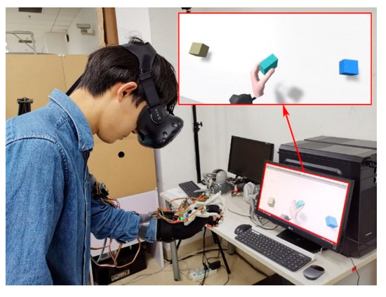 In the training phase, the participants gradually learned how to use our FFVS glove to touch and grasp cubes of various stiffnesses. After 5 min of training, each participant performed 20 trials. In each trial, the participant was allowed to grasp three cubes with the same size and shape but with different colors, as shown in Figure 13. The cubes were randomly assigned one of the following stiffness levels: 68, 370, or 725 Nmm/rad. The different colors of three cubes were only used for easy identification of these cubes and convenient reporting of the experimental results, and there was no corresponding relationship between the color and stiffness. Most importantly, the three cubes with different stiffnesses could achieve the same maximum visual deformation.