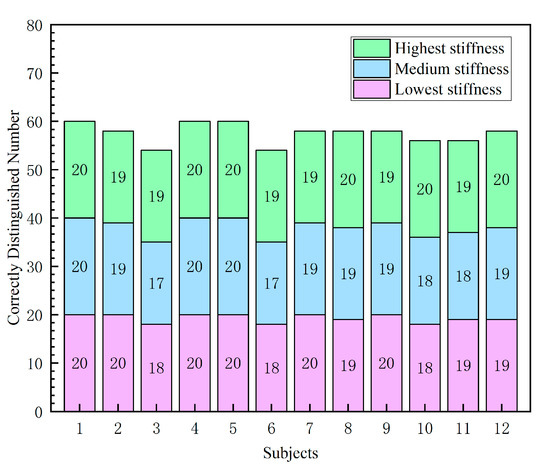 Figure 14 presents the data of all trials. The number in each bar segment represents the number of trials in which the participant correctly identified the stiffness level. Green bars, blue bars, and carmine bars represent the highest stiffness, the medium stiffness, and the lowest stiffness, respectively. The average identification accuracy of each stiffness level was higher than 93% for all 12 participants, with 17 being the lowest correct identification number in 20 trials for each stiffness level. These experimental results show that the proposed glove can effectively render objects of different stiffnesses and allow users to distinguish them correctly.
