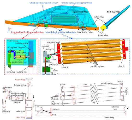 The structure of the research object in the present research is same as that in []. Each cable-spring folding wing is mainly composed of a group of lateral deployable mechanism and two groups of longitudinal locking mechanisms. Additionally, the lateral deployable mechanism is composed of a wheel–rope transmission system and a parallel spring driving mechanism, as shown in Figure 1.
