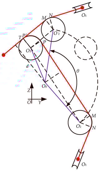 Here, O0 (y0, z0), O1 (y1, z1), O2 (y2, z2) and O3 (y3, z3) are projection positions of the cross-sectional center of the shaft, pulley O1, pulley O2, and chute O3 on the oyz plane; R2 is the equivalent radius of the pulley O2 and the cable; R3 is the equivalent radius of the chute O3 and the cable; N, M/M ’ or P/P ’, T are the tangent points of the pulley O1 and the pulley O2, the pulley O2 and the chute O3, the chute O3 and the hook, respectively.