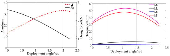 As shown in Figure 4, the curves between the driving force Fs, the arm d, the driving torque Md, the gravity torque Mg, the friction torque Mf, the resultant torque M and the deployment angle θ are obtained using the above formulas.
