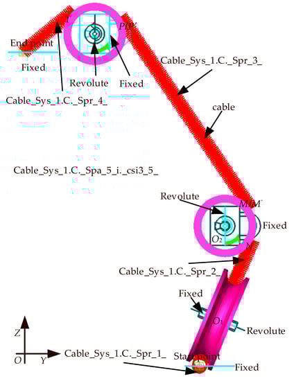 The third step is the generation of a wheel-rope transmission system. One can create related parts by calling the cable module in ADAMS. It is important to set appropriate parameters in terms of diameter, density and the Young’s modulus of the cable. Additionally, it is also necessary to set the section properties (such as width, depth, radius, angle), spatial layout (such as position, diameter, deflection angle), connection (such as connection type, parts), and the density of the pulleys and chute according to Table 1. Combining these parameters with the start point, the end point and winding sequence of the cable can generate a wheel-rope transmission system, as shown in Figure 5.