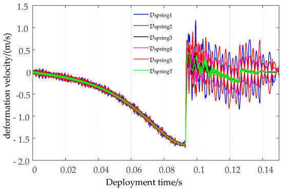 As shown in Figure 6, the curves represent the relationship between the deformation velocity of each compressed parallel spring, equivalent spring and deployment time, respectively.