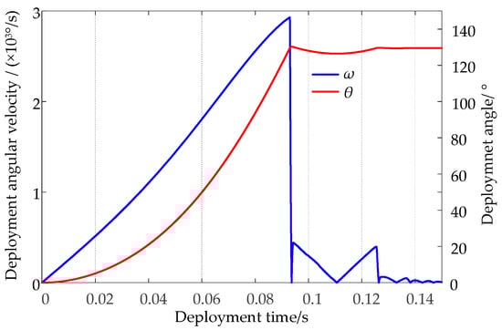 Formula (1) is a second-order nonlinear differential equation of the deployment time t. Among them, the prescribed position θp(te) is equal to 129.5°, and both the initial deployment angle θ(t0) and the initial deployment angular velocity ω(t0) are equal to zero. According to the numerical method of Runge—Kuta, the high-precision ODE 45 can be employed to solve the theoretical model of deployable mechanism. As shown in Figure 9, the relationships between deployment angle, deployment angular velocity and deployment time are obtained.