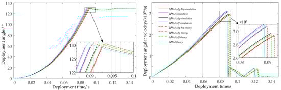 The results indicate that the relationships between deployment angle, deployment angular velocity and deployment time in the theoretical and simulation results are similar, with and without consideration of the influence of gravitational torque and frictional torque. This means that the tendency and values of the theoretical results are essentially consistent with the simulation results. Thus, the correctness and accuracy of the dynamic and simulation models of deployable mechanism are both verified.