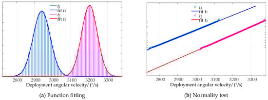 As shown in Figure 12, a normal distribution with a confidence level of 0.05 is used to fit the discrete dots of the deployment angular velocity of the mechanism, and the kstest method is used to examine the normality. Among them, the red lines represent the lower mechanism while the blue lines represent the upper mechanism.