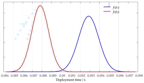As shown in Figure 13, f1(t1) and f2(t2) are the probability density functions of deployment time of the upper and lower mechanisms, respectively.