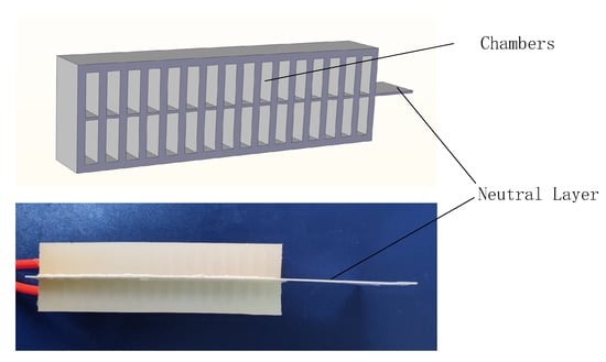 In our previous work, a soft pneumatic actuator with symmetrical chambers was fabricated [17]. This actuator was built with reference to Luo’s method [18]. It was built by using the material Ecoflex-0030. The structure of the pneumatic actuator is shown in Figure 1. It has two blocks with many chambers. There is an ABS plate between the two blocks. This plate is used as a neutral layer. The chambers in different blocks are connected through a channel to achieve a uniform pressure. The actuator can bend bi-directionally when the chambers of different blocks are filled with pressurized fluid.