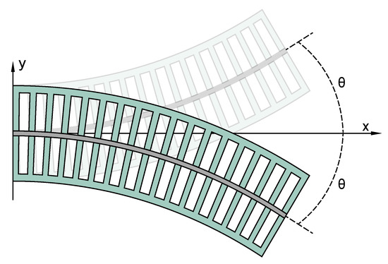It is assumed that the soft pneumatic actuator has constant curvature and the mass is distributed along the length uniformly. The detailed piece-wise constant curvature assumption can be found in [5,19]. The bending schematic of the soft pneumatic actuator is presented in Figure 2. The actuator is bent in the planer plane. The curve showed in the figure is the neutral layer of the actuator, is the bending angle. Since the driver is symmetrically constructed, the deformation in the other direction is the same. The figure just shows the one bending direction of the actuator. We define the bending angle in this direction as positive, the other direction as negative.