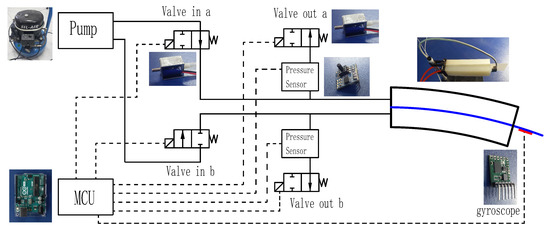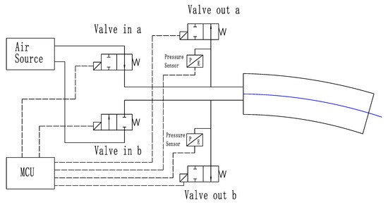 The pressure in the air circuit is controlled by using a microcontroller unit (MCU) to control the opening and closing of the air valve. The common systems such as stm32f103, arduino, etc., can be used as MCU of the control system.By controlling the air to inflate both chambers in turn, the actuator bends to both sides, thus making the actuator to swing like afishtail. According to the dynamic model proposed in Section 2, the pressure of different chambers, bending angle is collected. The bending angle is measured by the gyroscope which is mounted on the end of the neutral layer. The air pressure is measured by the pressure sensors after the inlet valves. Figure 4 shows the pneumatic control system of the actuator. The mounting of the sensors can also be seen.