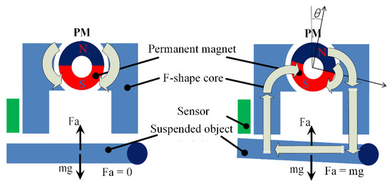 - Sun, F.; Oka, K. Development of noncontact suspension mechanism using flux path control by disk magnet rotation. Trans. Jpn. Soc. Mech. Eng. 2010, 76, 2916–2922. [Google Scholar] [CrossRef][Green Version]