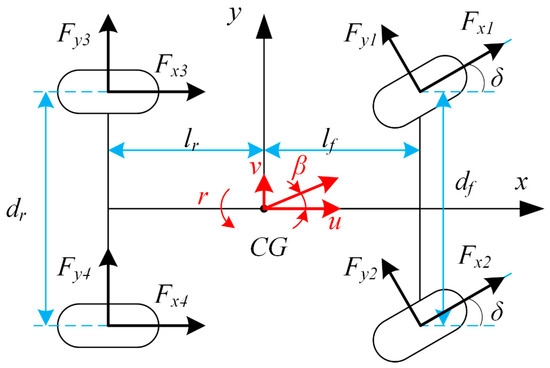 A seven-degree-of-freedom (7-DOF) vehicle dynamic model—including the longitudinal, lateral, and yaw motion of the chassis as well as the rotation of the four wheels—was constructed for controller design. The chassis plane motion model is presented in Figure 1. Table 1 displays the definition of the notation used in the model.