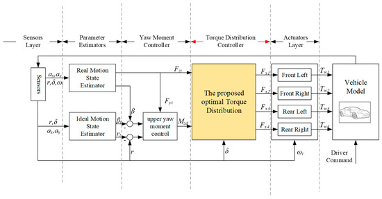 Of the current EVs, four-wheel independent-drive electric vehicles (4WIDEVs), with motors installed in each wheel, have great advantages in generating both traction and braking torque quickly, accurately, and independently. These merits make 4WIDEVs an ideal platform for active chassis control, especially for direct yaw moment control (DYC). The DYC system, in contrast to four-wheel steering (4WS) and active front-wheel steering (AFS), utilizes the yaw moment directly generated by a reasonable distribution of longitudinal forces to adjust vehicle motion [3,4]. Therefore, as the basis of a DYC system, torque distribution control plays a key role in maintaining vehicle stability [5,6,7].