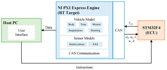 This paper used an HIL simulation to verify the effectiveness of the proposed optimal torque distribution approach. As illustrated in Figure 3, the HIL system comprises three subsystems: an NI PXI Express engine, an electronic control unit (ECU), and a host personal computer (PC).