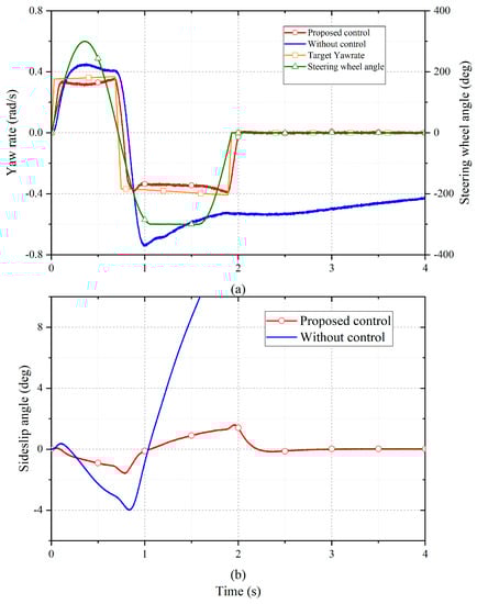 The detailed comparison in Figure 5c reveals that, when the control was not used, the sideslip angle increased rapidly after 5 s and ultimately exceeded the vehicle stability boundary. However, with the proposed control approach, the amplitude of the sideslip angle was always below 3° and changed smoothly, which means the vehicle could be easily handled by the driver.