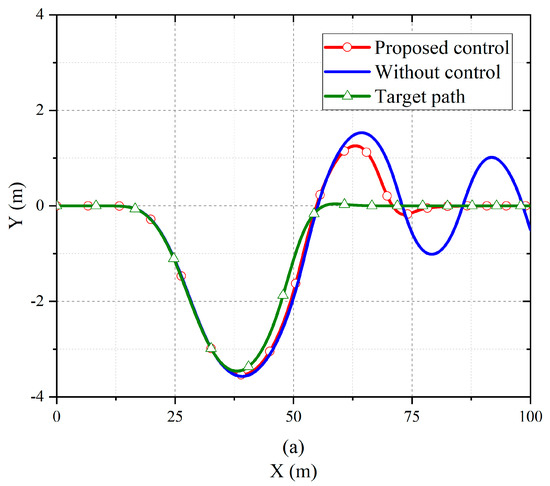 Figure 5a displays the vehicle’s trajectory. Figure 5b,c display the yaw rate and sideslip angle responses of the vehicles with and without the proposed optimal torque distribution approach. As illustrated in Figure 5a, the vehicle without control was not able to follow the expected trajectory. As illustrated in Figure 5b, without control, the yaw rate was constantly changing owing to the failure to follow the expected trajectory, meaning that the vehicle lost stability. By contrast, under the proposed control approach, the change of yaw rate was able to track the target yaw rate quickly and accurately, thus achieving vehicle stability control.