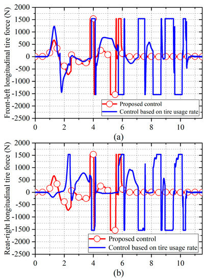 Figure 7e presents a comparison of the yaw rate responses. Under the proposed method, the yaw rate can track the target value very well. The curve obtained under the tire usage rate control clearly has a delay and a larger fluctuation around 5.2 s. Moreover, it takes longer to converge to the stable state than in the proposed approach. In conclusion, the proposed approach makes better use of the lateral tire forces to generate the yaw moment and improves the vehicle yaw response.