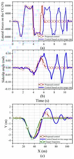 Comparison of the vehicles using the proposed control and the optimal tire usage rate control: (a) CG lateral force; (b) sideslip angle responses; (c) vehicle trajectory.