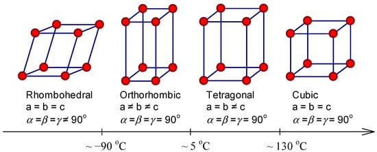 Schematic diagrams of phase transitions for pure BaTiO3 in the temperature range from −90 °C to 130 °C.