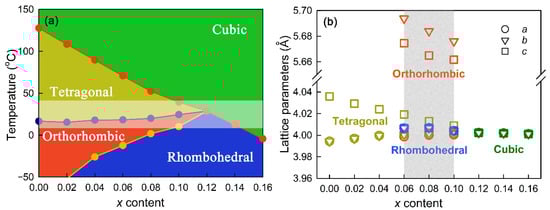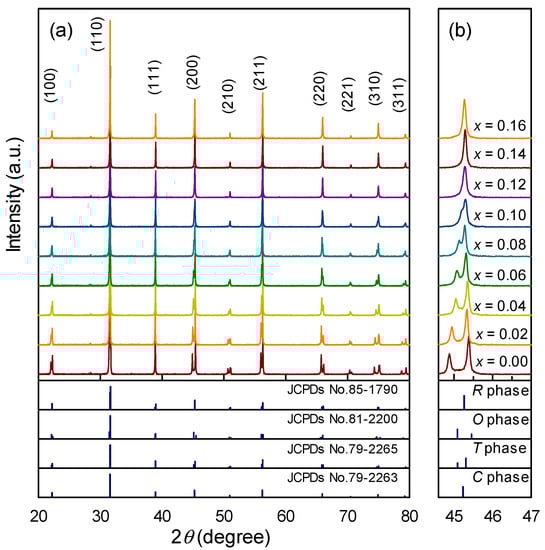 where RA, RB, and RO represent the ionic radius of the A-, B-site, and O2- in ABO3 structure, respectively. It is commonly recognized that the perovskite structure is stable with 0.77 < t < 1.09, and the value of t locates between 1.062 and 1.039 for BT-xCS (0.00 ≤ x ≤ 0.16), indicating the stable structure of BT-xCS solid solutions in this work. The enlarged (200) diffraction peaks with angles from 44.6° to 47.0° are given in Figure 2b to clearly show the phase evolutions. It is clear that the diffraction peaks of the compositions with x < 0.04 are assigned to the T phase, and those of the compositions with x > 0.12 correspond to the C phase. Note that the diffraction peaks of the compositions with 0.06 ≤ x ≤ 0.10 are not separately matched well with those four R, T, O, and C phases, which can be described as phase coexistence. Similar results have been reported in other elements modified BT-based ceramics [,,,,]. Furthermore, the (200) peak shifts slightly towards higher degrees with the increase of x content, indicating the shrinkage of the lattice parameters, and this can be ascribed to the decrease of the ionic radius in A-site, 134 pm for Ca2+ compared with 161 pm for Ba2+ in 12-fold coordination.