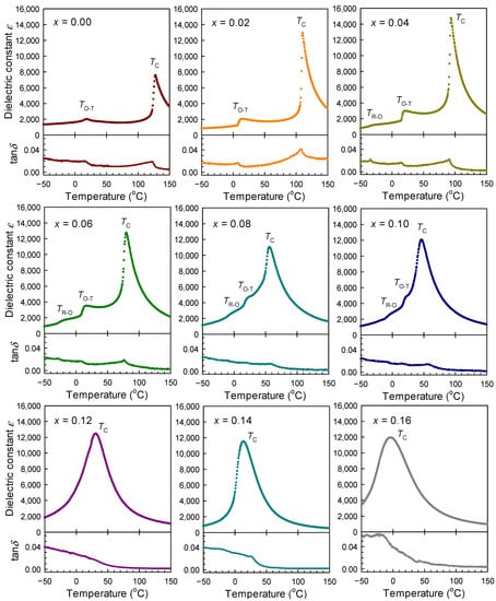 Temperature-dependent dielectric constant ε and loss tanδ of BT-xCS (0.00 < x < 0.16) measured at 100 kHz.