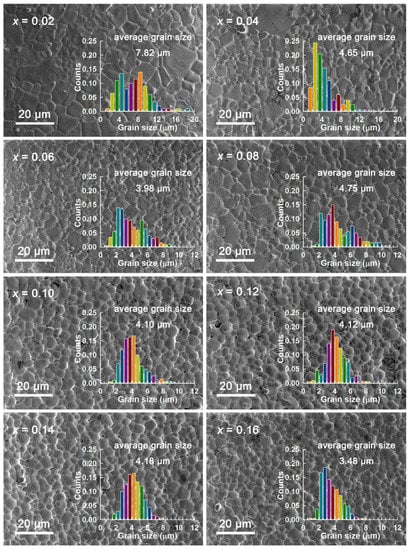 Previous investigations have shown that the BaTiO3-based ceramics exhibit an enhanced dielectric response as the grain size decreases to micron level due to the grain size effect [,]. The SEM images and grain distributions of BT-xCS (0.02 ≤ x ≤ 0.16) ceramics are shown in Figure 5. All the samples are densely sintered with distinctive grain boundaries, and the relative density of each composition is over 95%. The insets of Figure 5 are the distributions of grain size and the average grain size corresponding to each composition. It is obvious that the microstructure of BT-xCS is dependent on the substitution of CS. The grain distributions are inhomogeneous in the compositions of x < 0.06, which are similar to the grain morphology of pure BT []. For example, the grain size of large grains in the composition of x = 0.02 is approximately 20 μm and that of small grains is only about 4 μm. The variation of grain growth in the range of 0.06 ≤ x ≤ 0.10 may be ascribed to the phase transition around room temperature induced by composition. With further increase of x content, the grain tends to distribute homogeneously and the grain size is nearly unchanged in the compositions of x > 0.08. However, further doping of CS (x = 0.16) leads to the decrease in grain size, which may be attributed to the excess doping of CS concentrates near grain boundaries and inhibits the grain growth of BT-xCS ceramics.